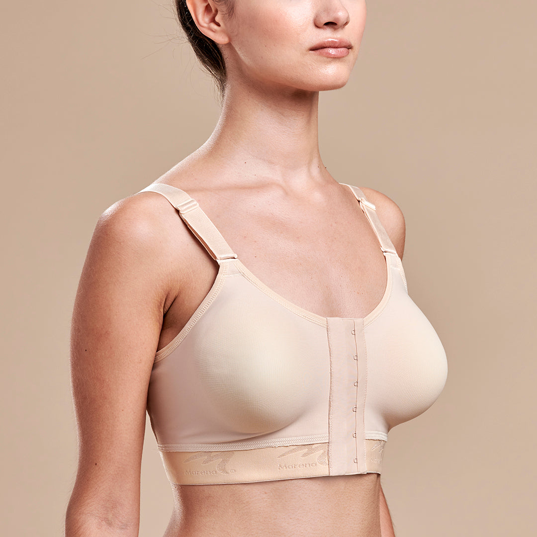 Notre nouveau soutien-gorge FlexFit™ à couverture moyenne est doté de bretelles amovibles et verrouillables à l’avant pour un accès clinique facile et un enfilage simplifié après une chirurgie mammaire. Grâce à ses bonnets FlexFit™, ainsi que ses bretelles et fermetures réglables, ce soutien-gorge s’adapte aux variations de taille causées par le gonflement. Les bretelles sont ajustables à l’aide de glissières, et la fermeture avant à crochets et œillets sur 3 rangées permet un ajustement complet. Ses coutures tournées vers l’extérieur évitent toute gêne au niveau des sutures, et sa bande inférieure large s’étend au-delà du pli sous-mammaire. Notre tissu breveté TriFlex™ offre une élasticité supérieure pour prévenir les pincements, facilite l’évacuation de l'humidité et assure une protection antimicrobienne active à l'argent. Lavable en machine.
